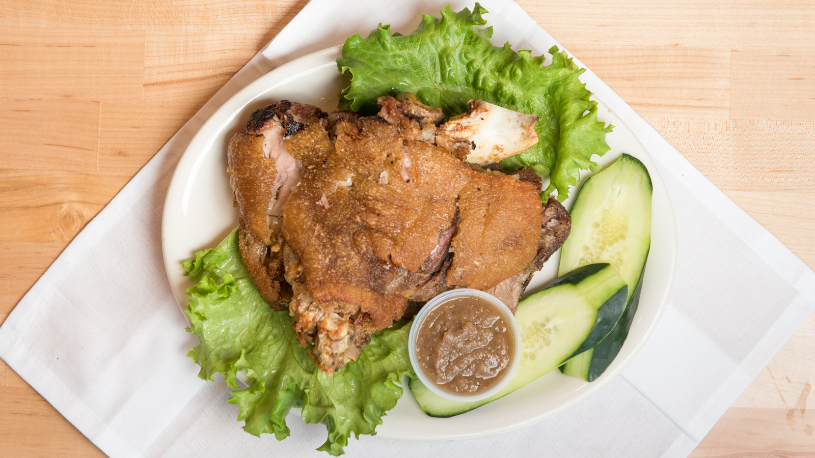 Crispy-fried marinated pork hock served with garlic vinegar sauce. Serving for two to three.