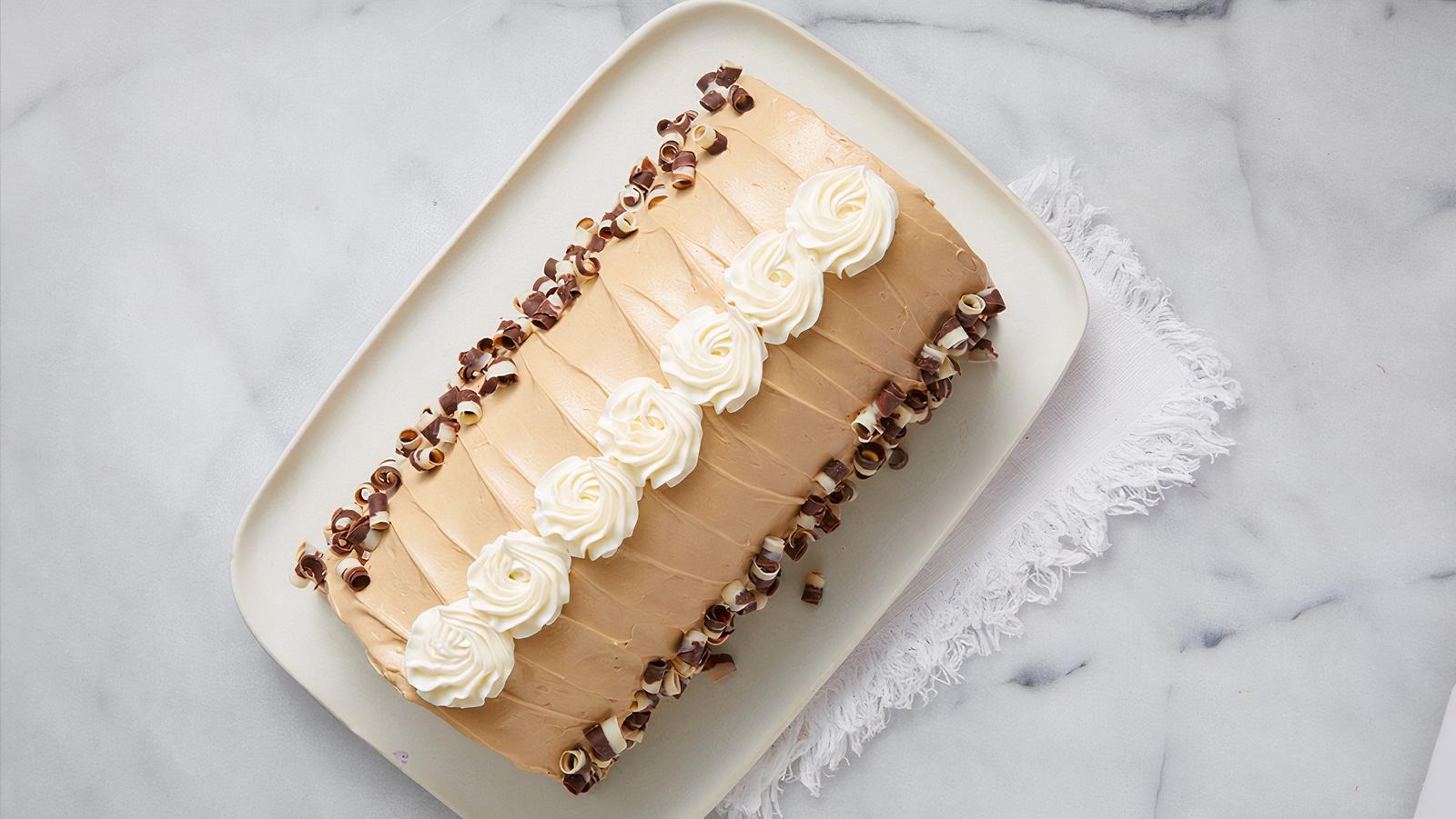 Mocha sponge cake roll filled and iced with mocha buttercream.