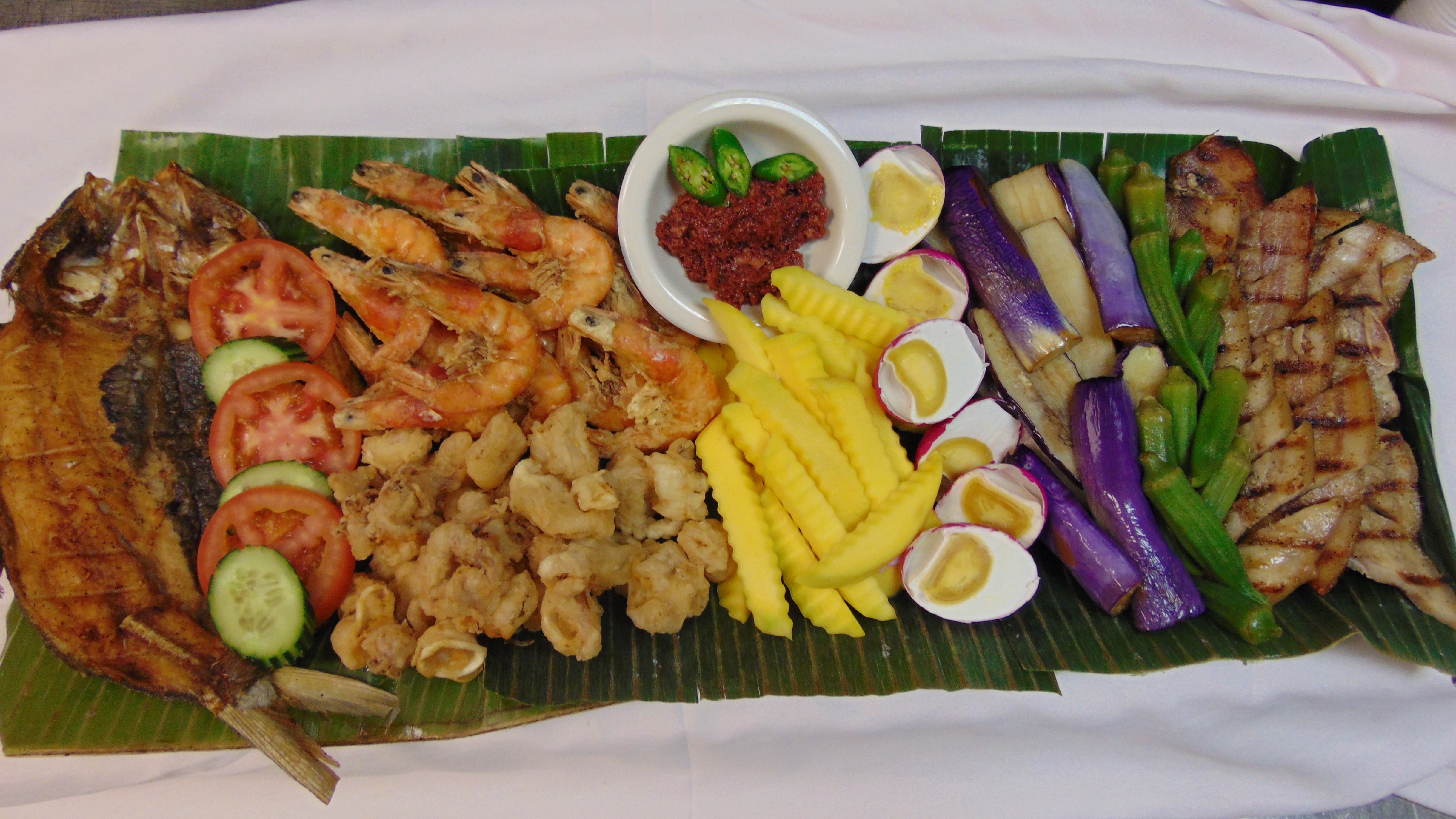 Serves 3 - 4. Combination of grilled whole pampano, grilled squid, pork belly, and eggplant served with diced tomatoes, mangoes, and bagoong (shrimp paste). Served with either steamed rice or garlic fried rice.