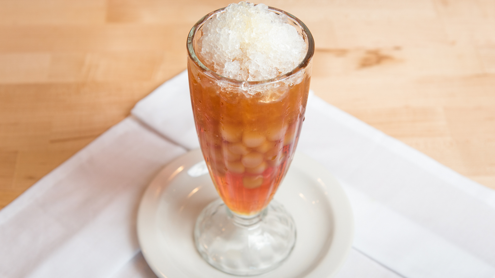 A refreshing Filipino beverage with tapioca pearls and clear jelly in brown syrup and topped with crushed ice.