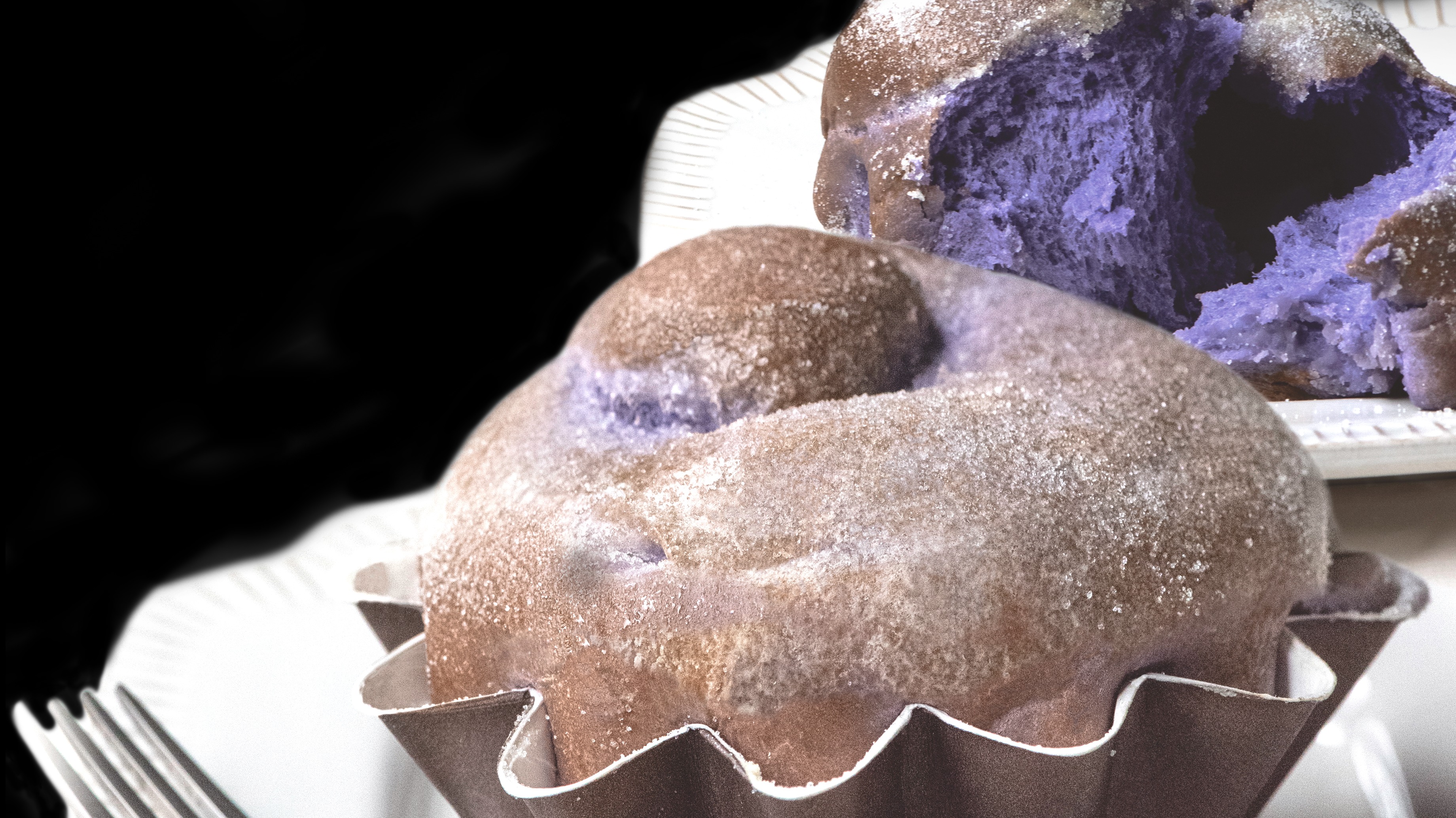 Sweet butter bread made with ube (purple yam) incorporated in the dough topped with butter and sugar.