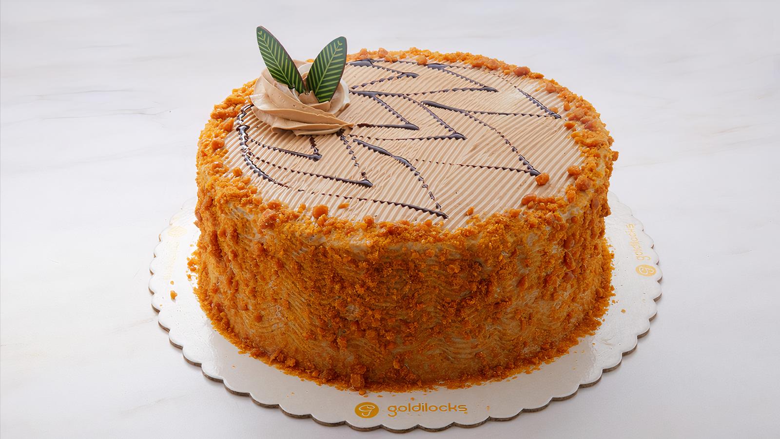 Layers of chocolate and mocha chiffon cake filled and topped with mocha buttercream and sprinkled with toffee crunch bits. Serves 8-12.
